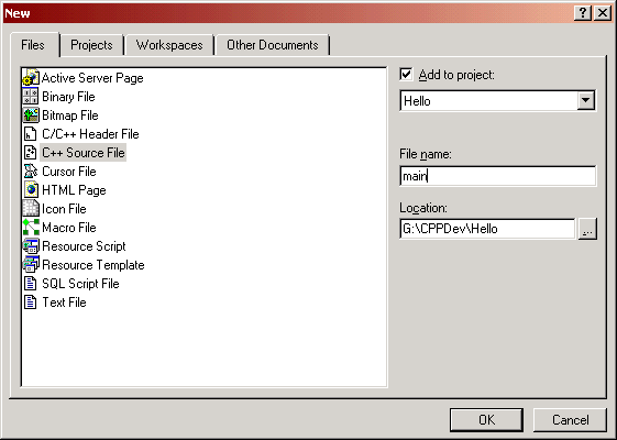 Hier wählen wir, dass wir eine C++ Quellcode-Datei erzeugen wollen.